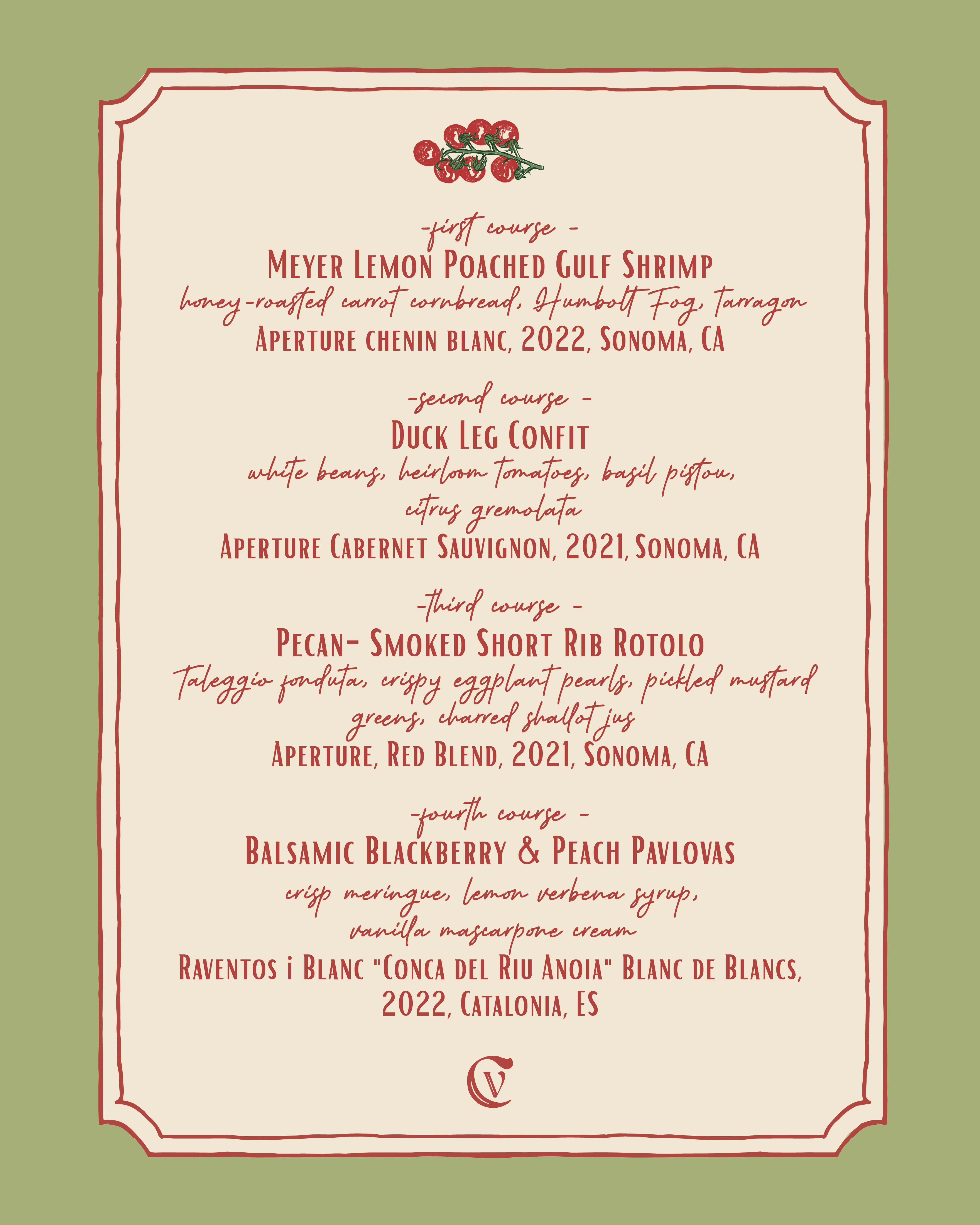 Paired perfectly with a four-course dining experience from Executive Chef Amy Mehrtens that ties together the bold character of Aperture wines and the fresh flavors of summer produce.